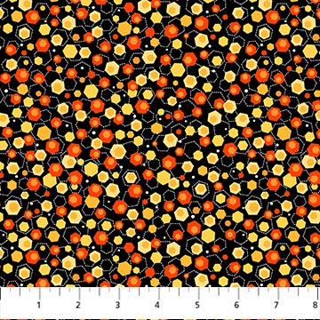 black background with hexagons in yellow and orange tones